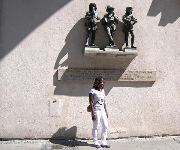In den Durchgang des Karlstores wurden drei Straßenmusikanteneingelassen. Sie musizierten zuvor am alten Fischbrunnen, der bis 1944 am Marienplatz stand.