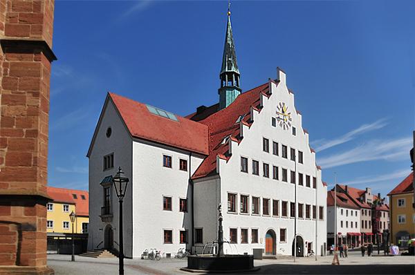 Rathaus am Rathausplatz 1,um 1430 spätgotisch erbaut, 1945 zerstört, 1956/57 wieder aufgebaut.