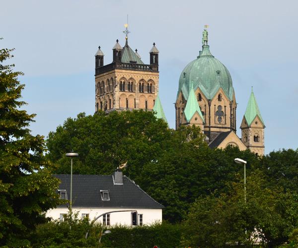 Münster St. Quirinist eine der bedeutendsten spätromanischer Kirchen im Rheinland, zum Teil gotisch, reich gegliederte Architektur, barocke Kuppel (1741) 46 m hoch.