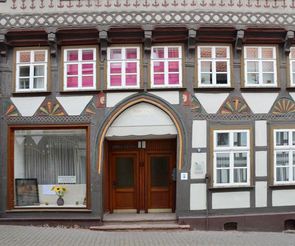 Ackerbürgerhaus als Dielenhaus im 16. Jh. erbaut,später durch Kaufleute und Handwerker bewohnt, neuerdings mit FDP. Narrenköpfen beidseits über Torbogen.