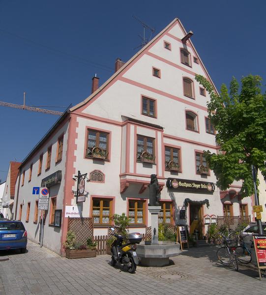 Löwenbrunnen vor dem Gasthaus StegerbräuAb 1830 lungerte hier einst ein steinernes Tier, bis es im Foyer des Rathauses versetzt wurde. Zum Ausgleich steht nun an alter Stelle einen Brunnen mit Bronzefigur, die der hier abzweigenden Straße den Namen gab. |