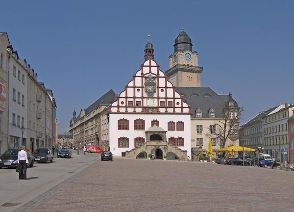 Altes Rathaus Plauen,1382 erbaut, mit prächtiger Renaissancefassade (1548) und Kunstuhr von Meister Puhkaw aus Hof. Es beherbergt das Spitzenmuseum.