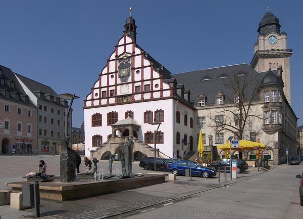 Brunnen am Altmarkt, dazu deutlich Altes und Neues (später angebautes) Rathaus der Stadt Plauen.