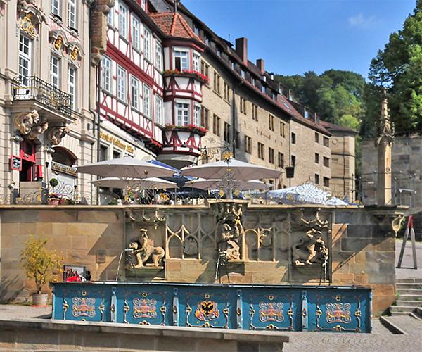 Farbenprächtiger Brunnen (1509) am Markt neben der Tourist-Information von Schäbisch Hall