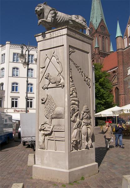Dtele am Marktplatz von Schwerin.Sie rinnert an den Stadtgründer Sachsenherzog Heinrich den Löwen und folgt dessen Spur. Bis ins Exil?