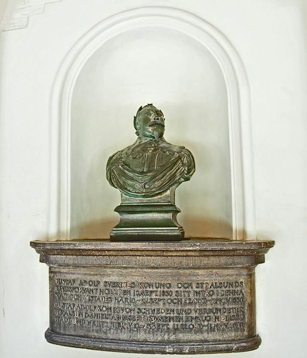 König Gustav Adolf von Schweden.Im Rathaus erinnert die Büste 1815 König Gustav Adolf an die bis 1815 währende Schwedenzeit. 1628 belagerte Wallenstein vergeblich die Stadt, der dänische und schwedische Truppen beistanden.