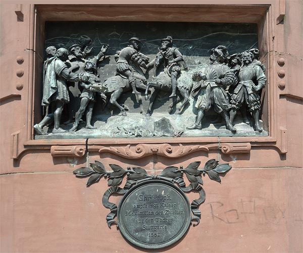 Denkmal DetailGußplatte mit Erläuterung: "Christoph empfaengt Kaiser Maximilian den Zweiten vor den Thoren Stuttgart´s 1562."