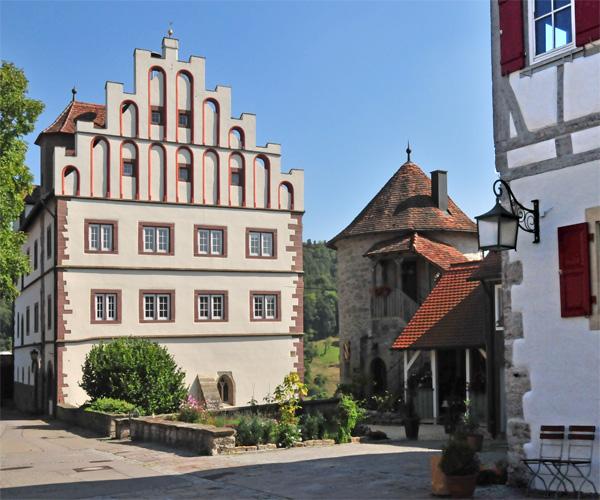 Unteres Schlossmit Staffelgiebel steht dicht an der Befestigungsmauer neben einem Wachturm.