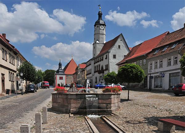Marktplatz von Weißensee.Der schöne Wasserlauf ist flankiert von sehr in Mode gekommenen Stolperstelen, den Schritt des Besuchers auf die Marktperipherie lenkend.