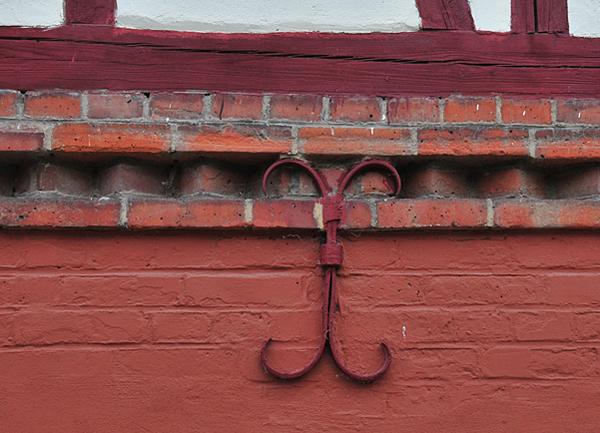 Fachwerk auf Ziegelunterbau, vorsorglich verankert gegen Ausbeulung des Mauerwerks, damit sich nicht die Balken biegen.