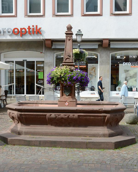 schlichter Marktbrunnen mit ergänzendem Blumenkontrast