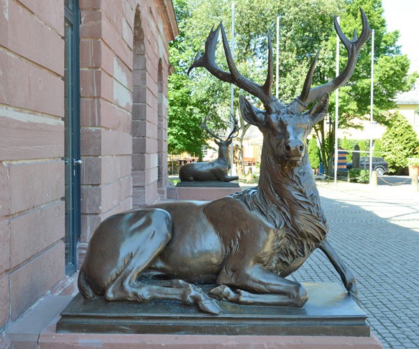 Hirsche vor Schloss Platte.Aber die Aussicht bis zum Rhein und die Wanderwege sind einen Besuch wert, auch ohne Hirschgulasch.
