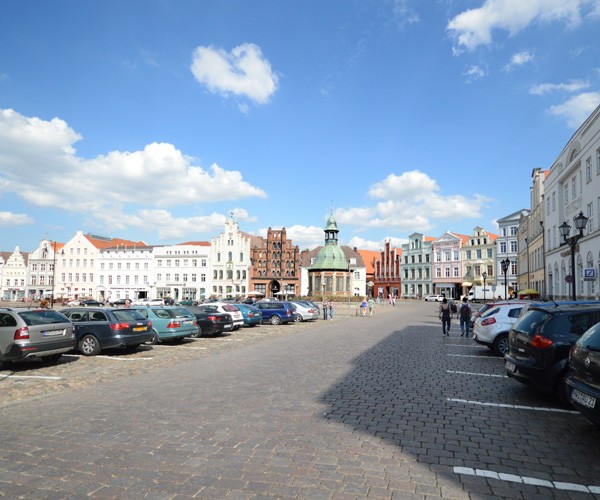 Marktplatz.Er war ursprünglich sogar noch größer. Rechts die auch technisch bedeutende Wasserkunst. Das links sichtbare Backstein-Bürgerhaus steht unverrückbar seit 1380 an dieser Stelle.